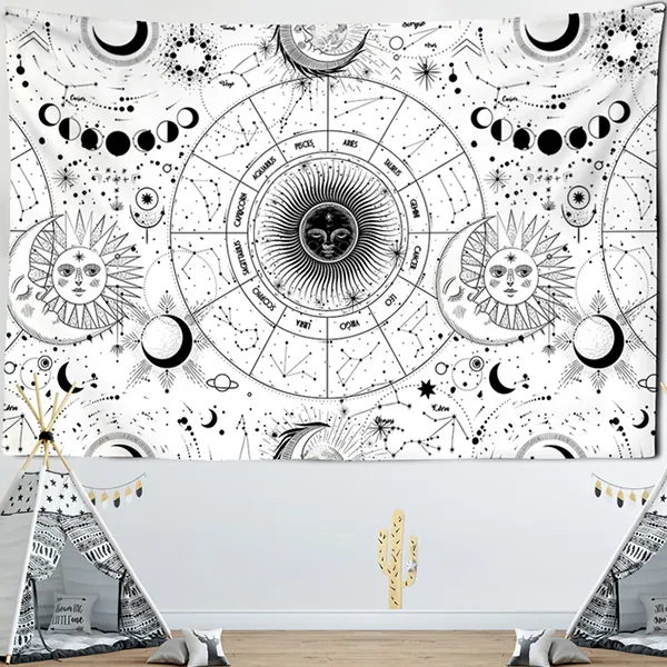 The Zodiac Tapestry honors the king of your home and guarantor of your personality. Printed with the world of the zodiac in a brightly lit frame on a white background, the White Astrology Tapestry can be used in a Scandinavian or mid-century modern interior design scheme. Like its black and white counterpart, this type of tapestry is washable and removable. However, the white astrology tapestry stands out for its more illuminated look in the set of inlaid constellations.
